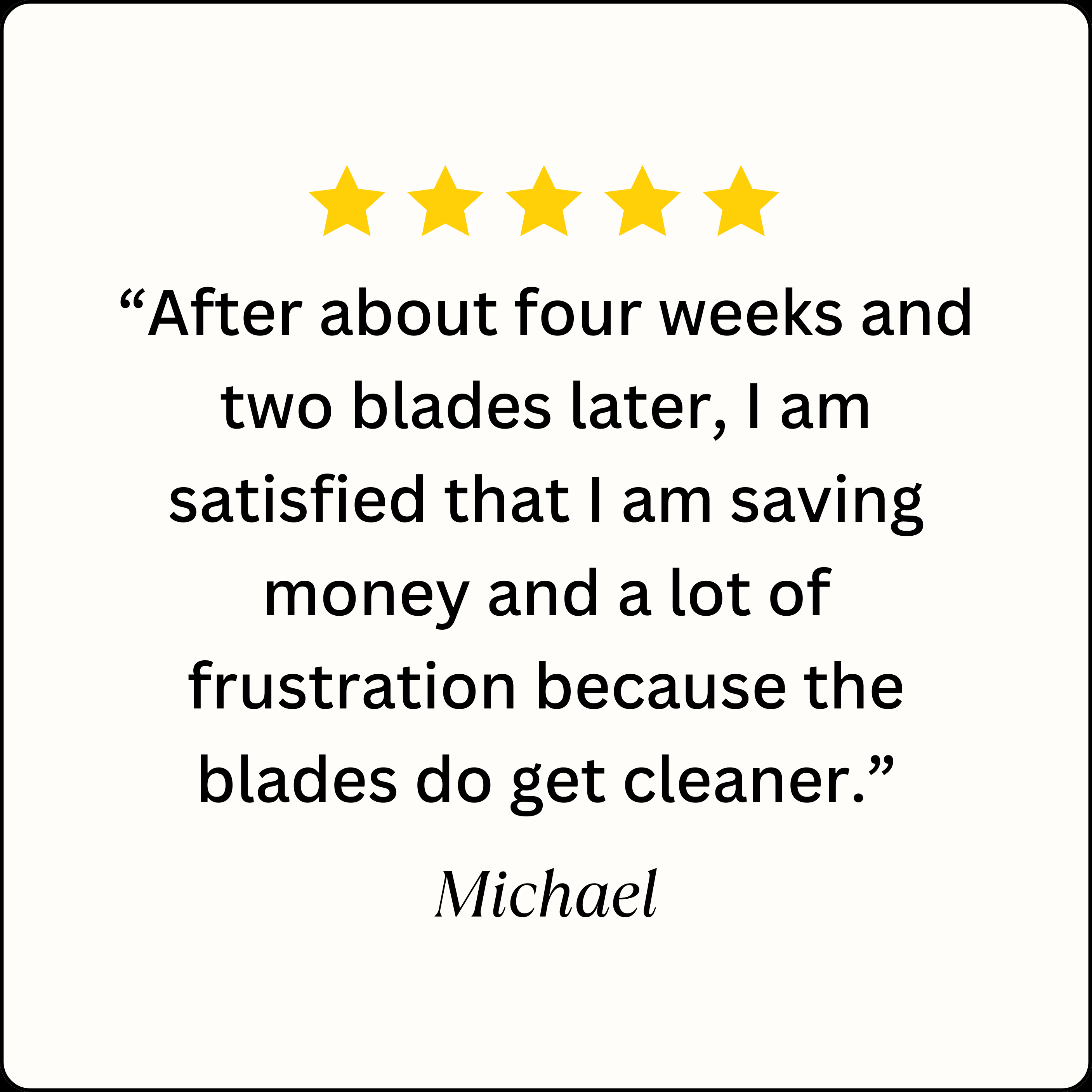 Pressing your razor into the Razor Rinser activates powerful water jets that unclog the hair and gunk from between the blades. The water recycles through filters, so 4 oz lasts your whole shave. When you're done, just dump it—anywhere but your clean sink!